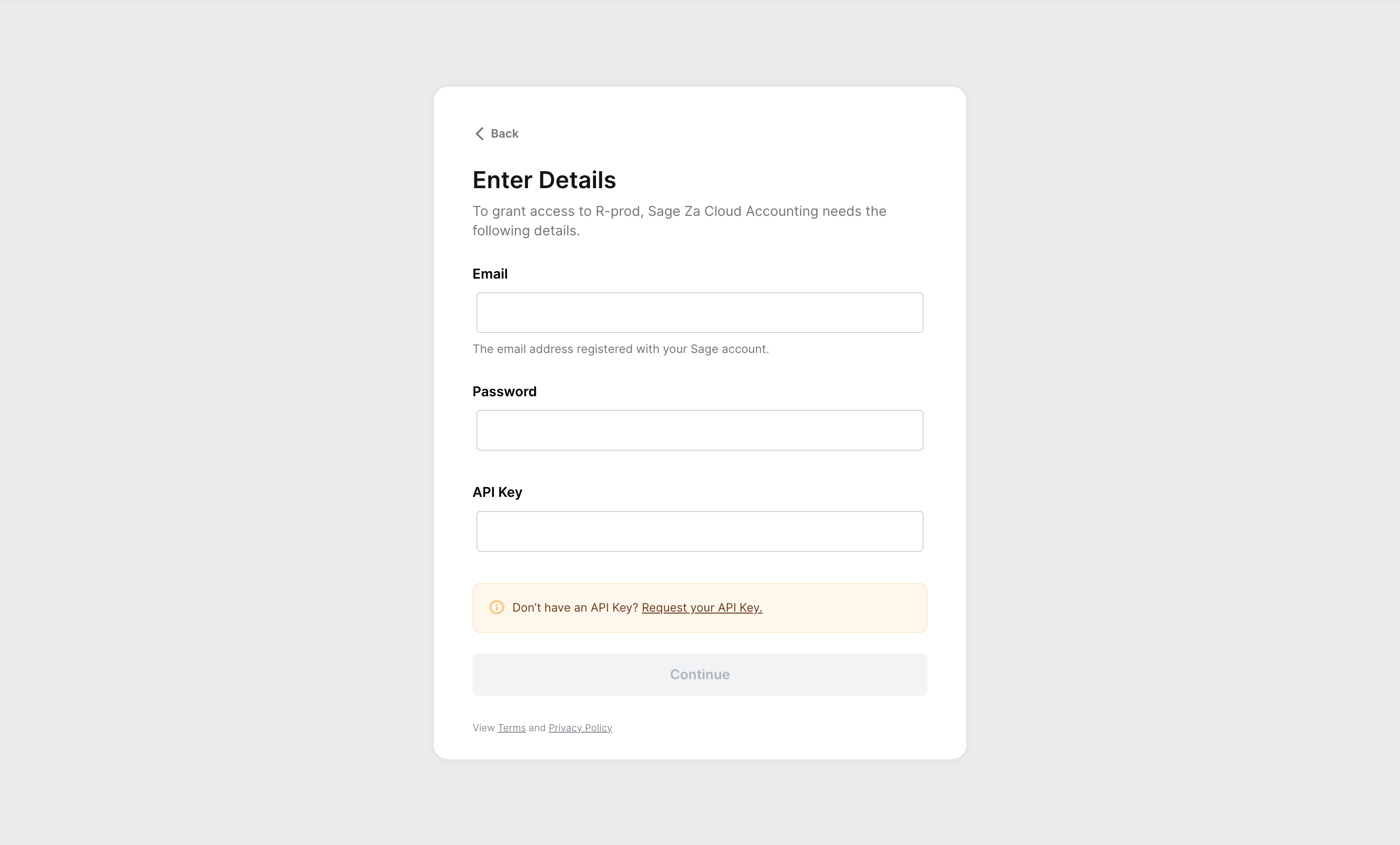 When your customer is connecting their Sage ZA account to RootFi, they will need to enter their credentials on RootFi’s invite link setup. They will need to fill the following information:- Email Address: The email with which you will login to your Sage ZA Dashboard.