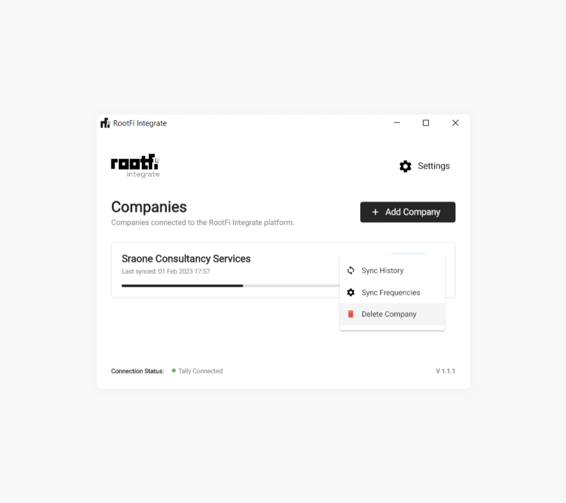 - Once the user selects the desired company, the syncing process will commence and the user will be able to view the connected company on the Companies screen of the Tally on-premise connector.