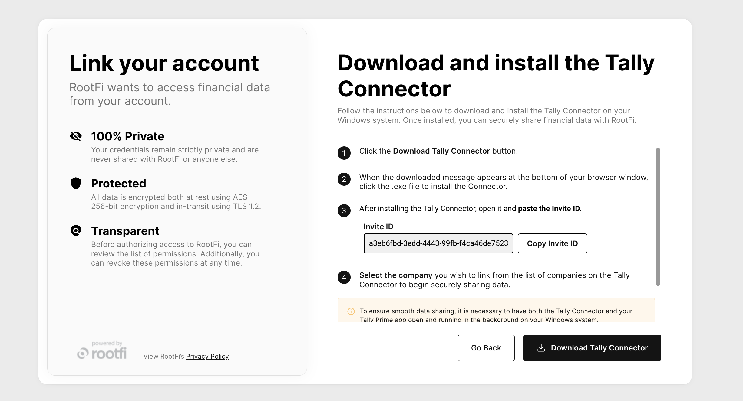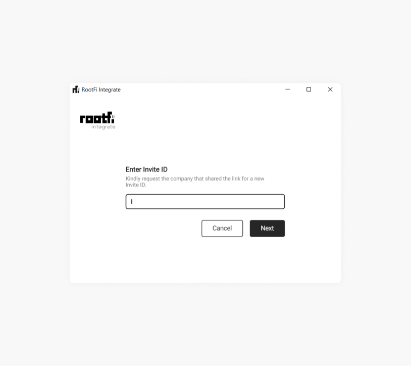 Firstly, the user needs to copy and paste the Invite ID from the RootFi Connect Link or Connect SDK and click on ‘Next’ to proceed to the next step.