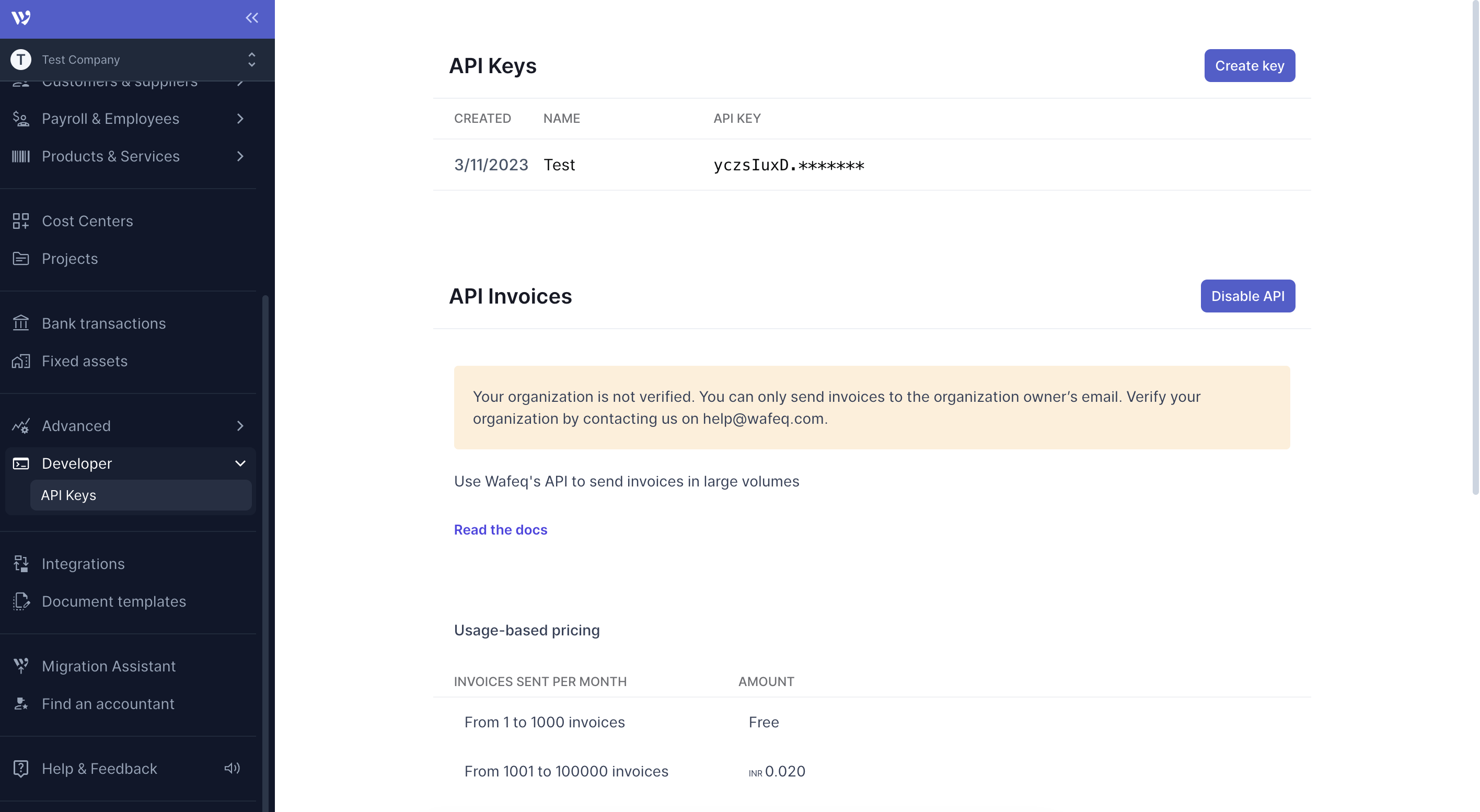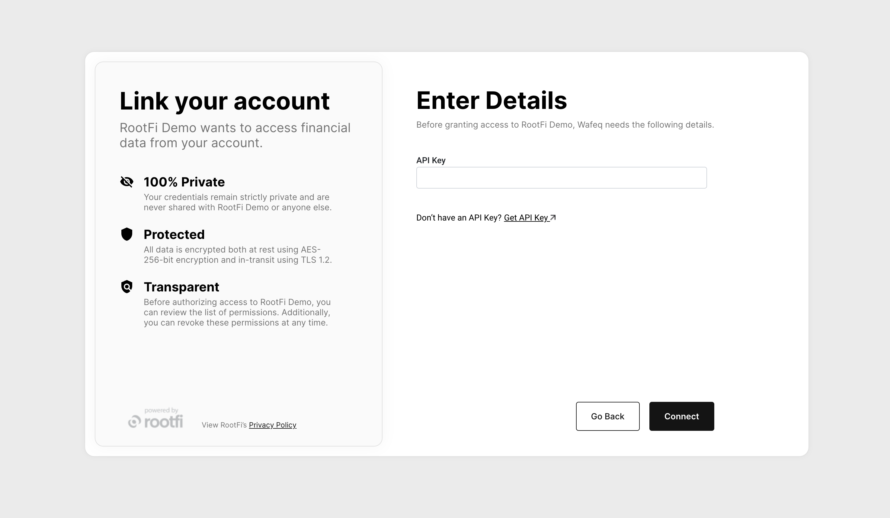 When your customer is connecting their Wafeq account to RootFi, they will need to enter their API Key on RootFi’s invite link setup.- API Key: The key generated in the above steps.