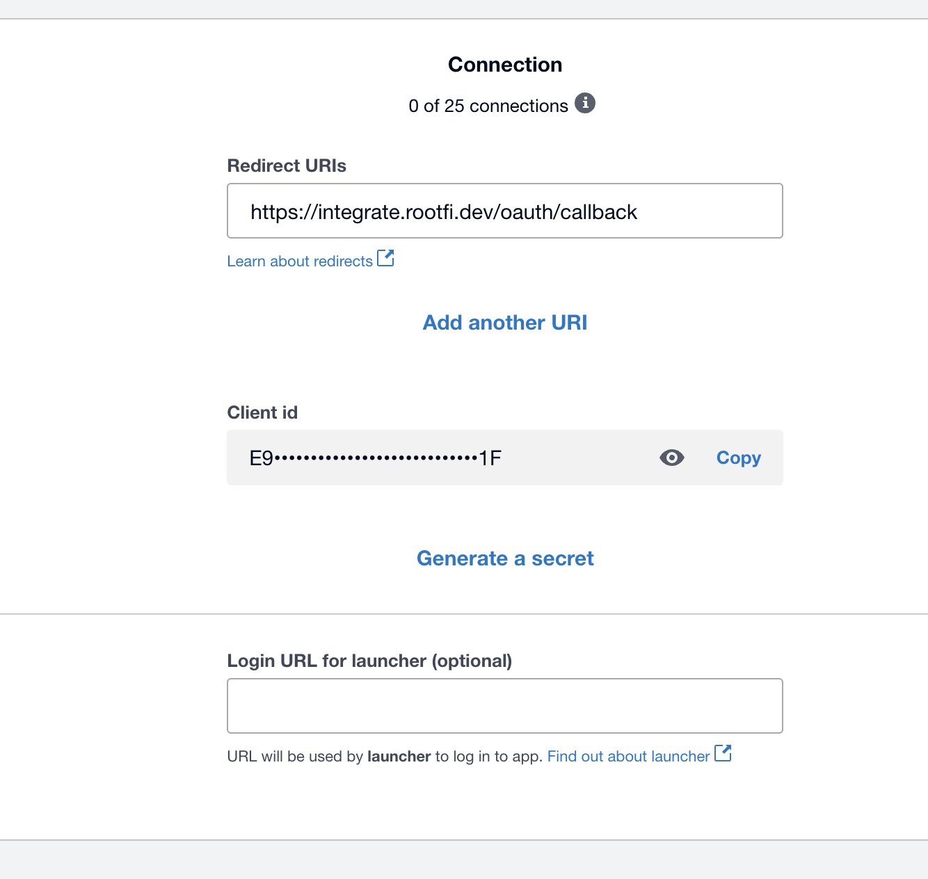 - In the ‘Redirect URIs’ field, enter ROOTFI CALLBACK URL