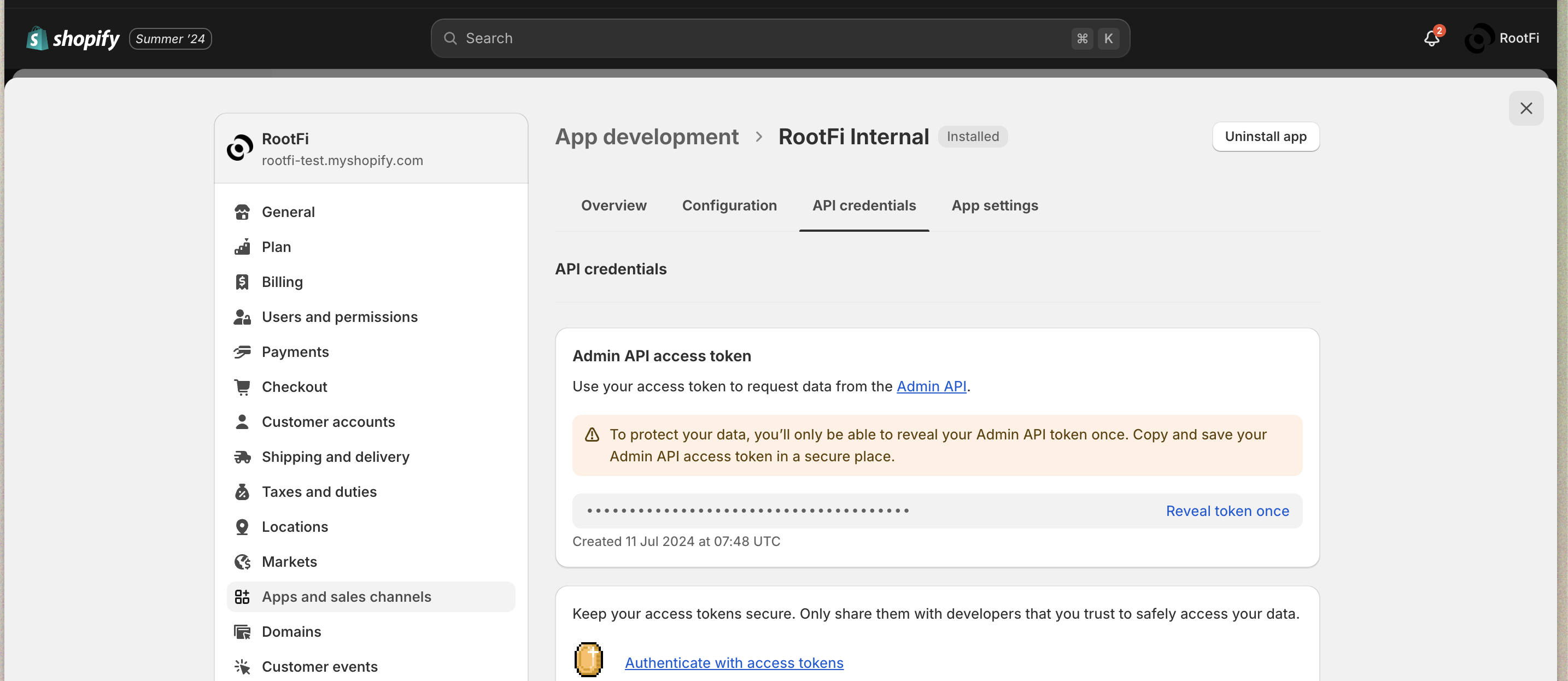 - Click the ‘Configurations’ tab for the new app created and click ‘Configure’ on the ‘Admin API integration’ card.