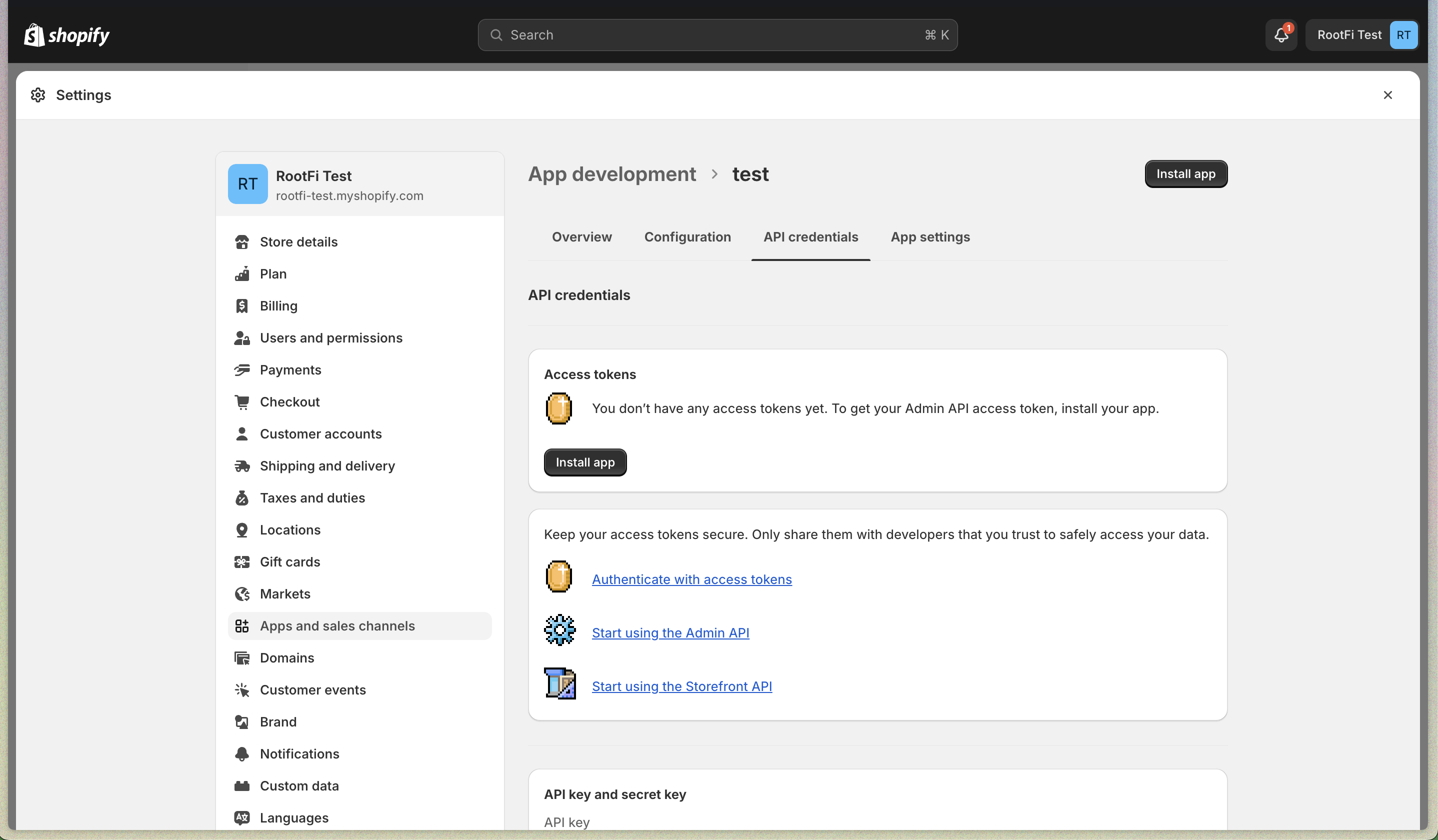 - Go to the ‘API Credentials’ tab and click on ‘Install app’ in the ‘Access tokens’ card. This will generate the API Key and Secret Key.