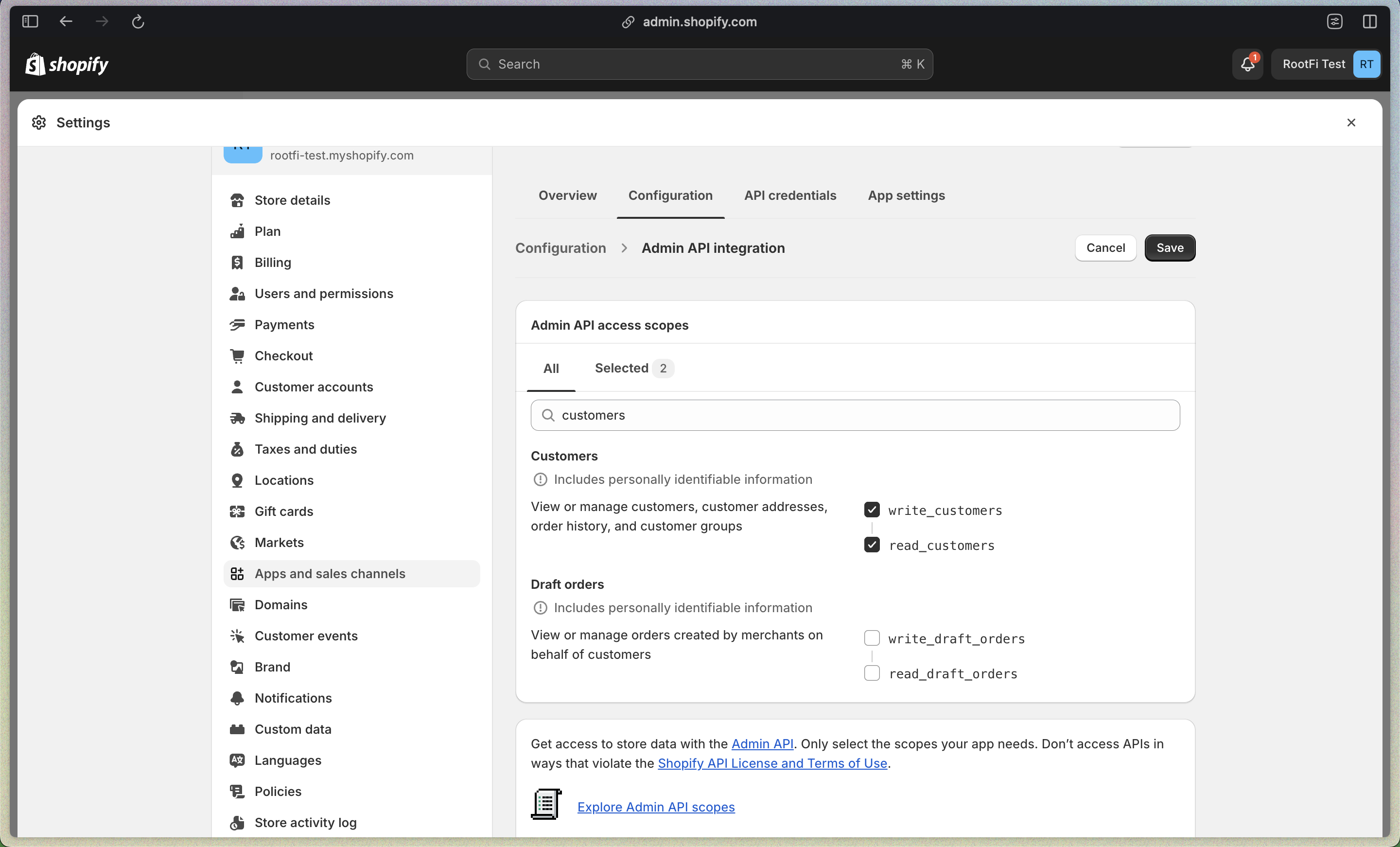 - Now, you will have to enable access to needed data models that you want RootFi to sync. We recommend at least giving access to Products, Orders, and Customers.