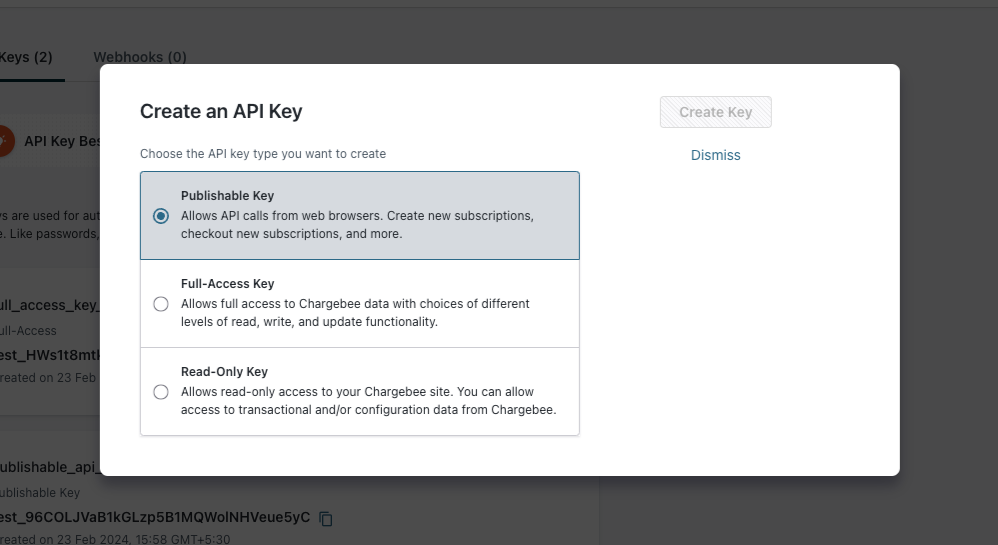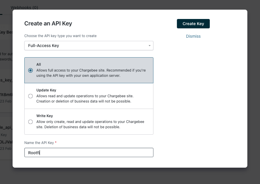 - Choose the type of access you want to give to the API key, name the key and click on ‘Create Key’.