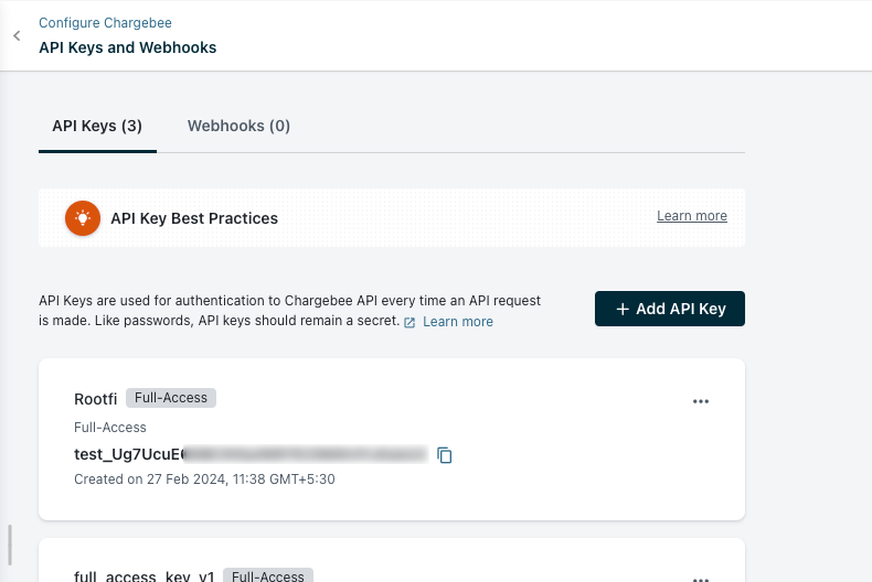 When your customer is connecting their Chargebee account to RootFi, they will need to enter their API Key on RootFi’s invite link setup.- API Key: The key generated in the above steps.