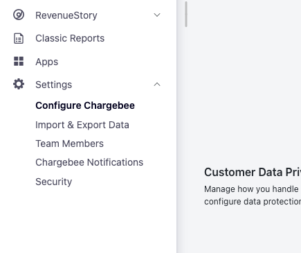 - Login in to you Chargebee dashboard and go to ‘Settings’ —> ‘Configure Chargebee’