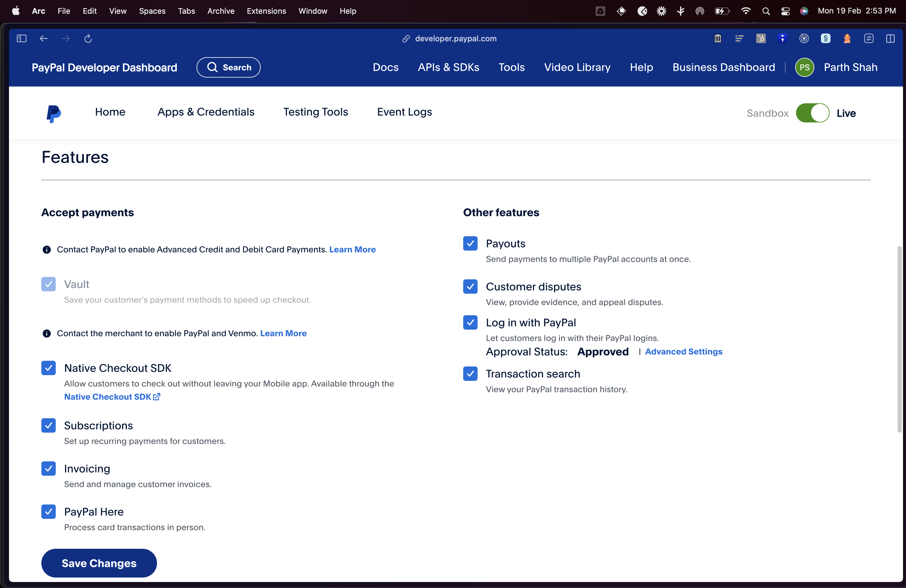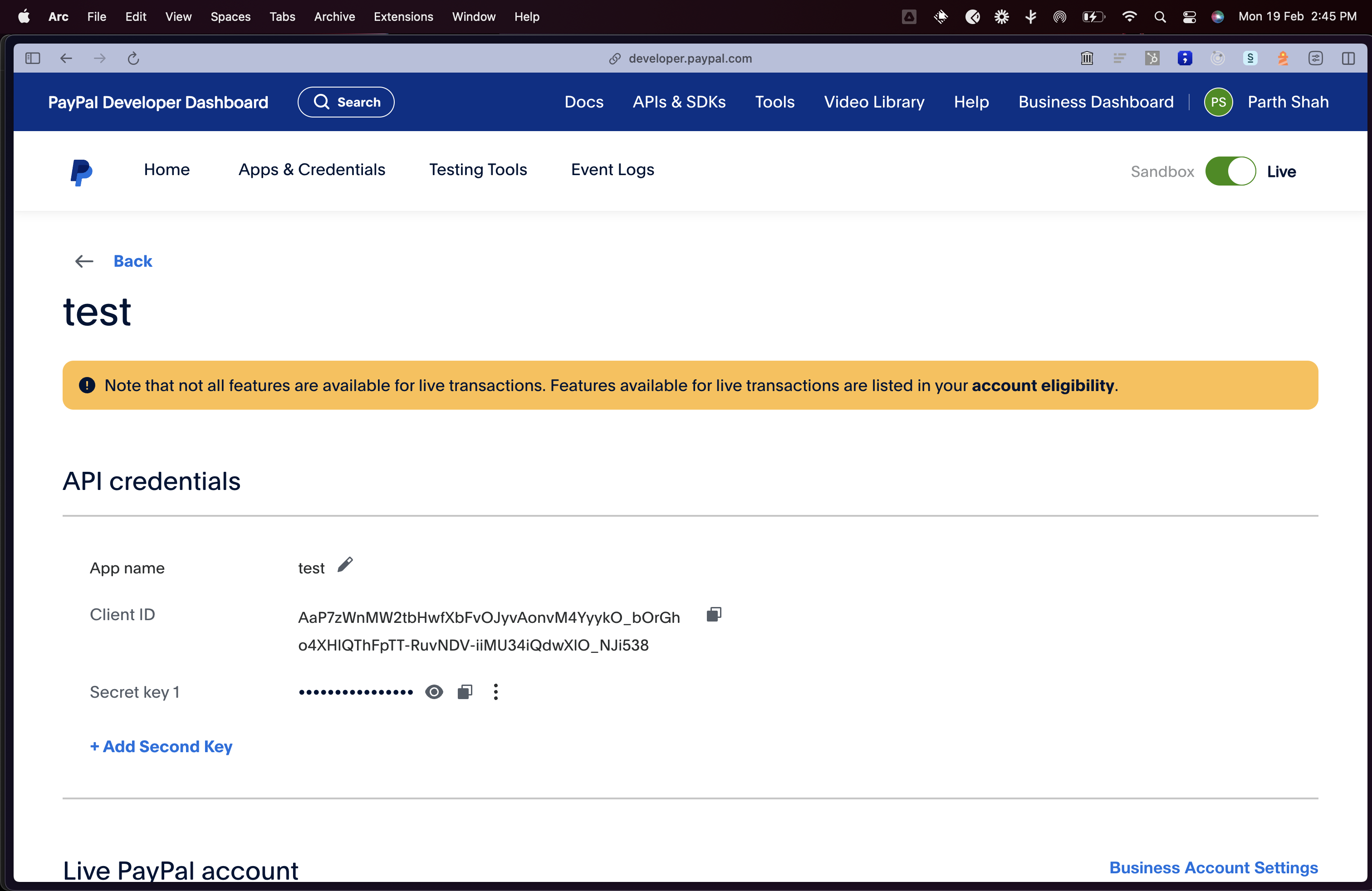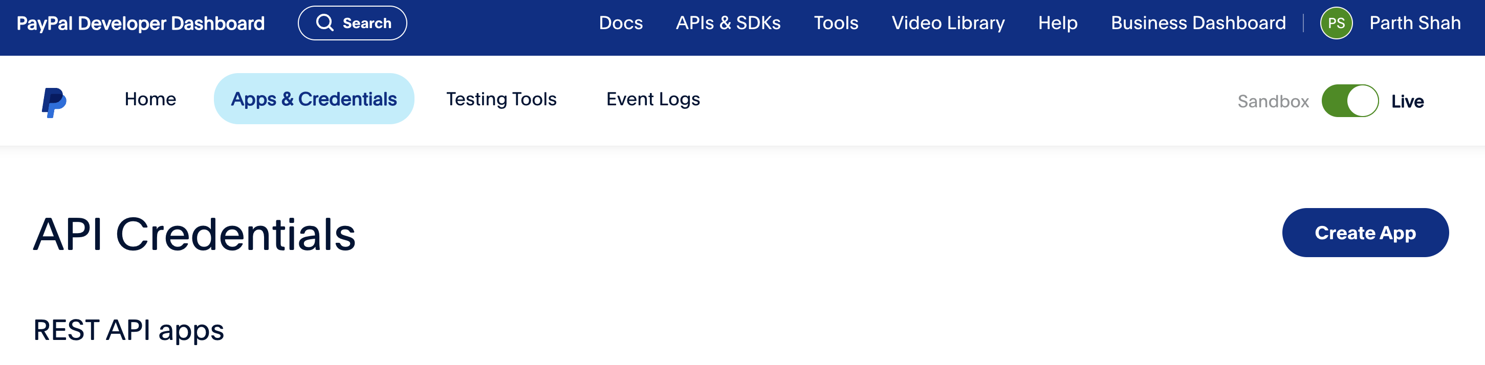 - Go to the Apps & Credentials Page on your Paypal Developer Dashboard