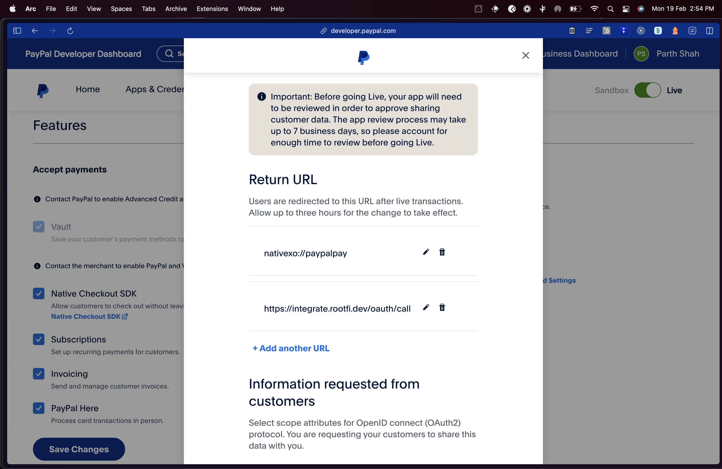 - Scroll down to the “Features” section, toggle the “Log in with PayPal” switch to enable it and click ‘Advanced Settings’ to enter the redirect URL