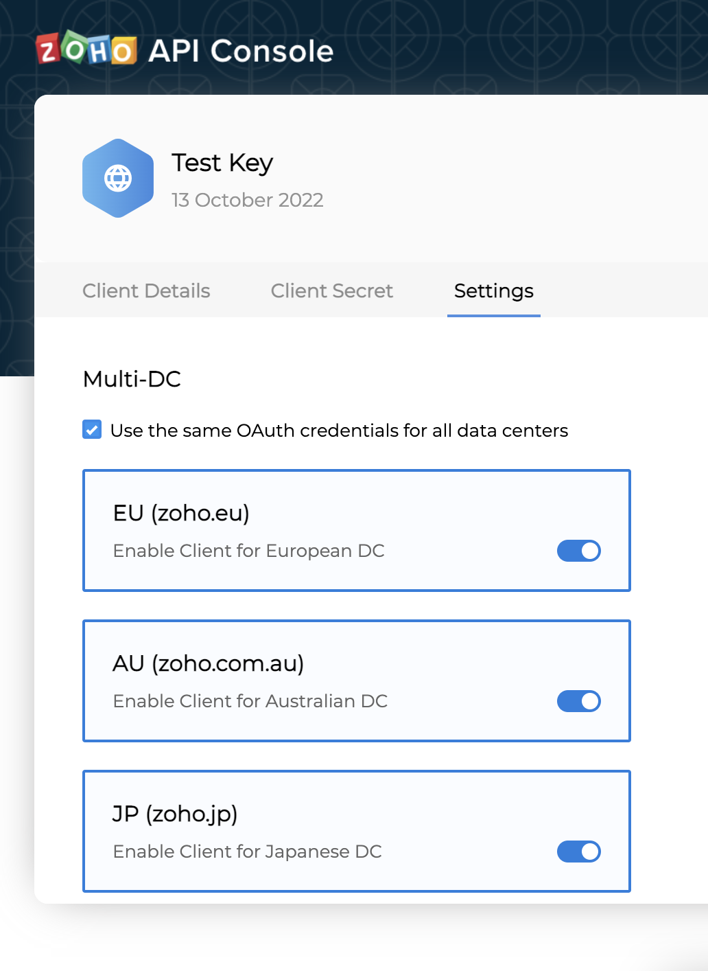 - Finally, you select the ‘Settings tab’, enable the regions where you have customers, and check the box which says ‘Use the same OAuth credentials for all data centres.‘